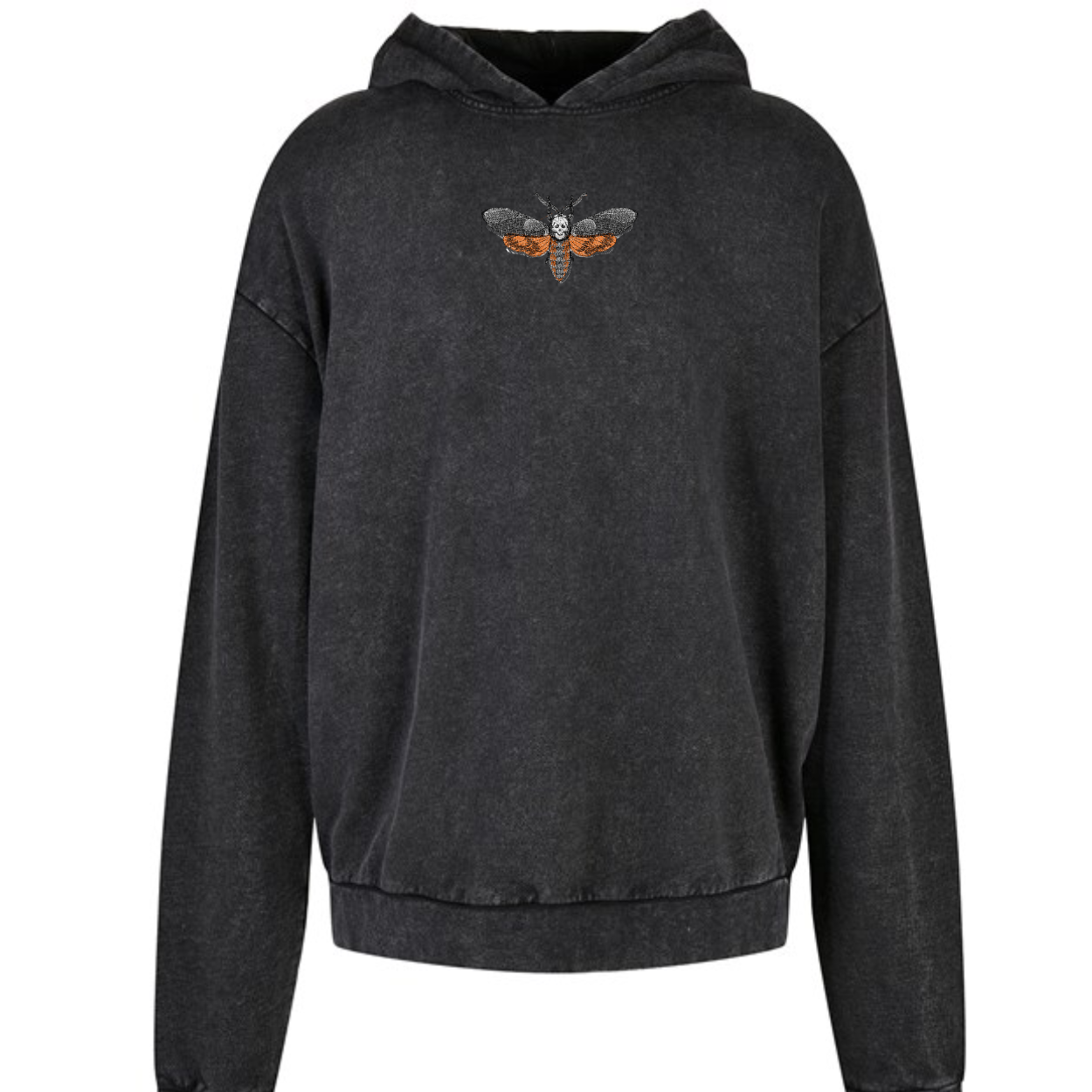Elevate your wardrobe with our unisex hoodie, designed to exude confidence and style. Washed with a modern acid wash, this hoodie boasts a trendy, edgy appearance that sets you apart from the crowd. With dropped shoulders and an oversized cut, it strikes the perfect balance between sporty and casual. The hood features a centrally placed dividing seam, replacing traditional drawstrings for a sleek and contemporary look. Crafted from pure cotton and equipped with rib cuffs and hem, this hoodie offers both comfort and durability. Adorned with a gothic, alternative deaths head moth embroidery design, it adds a touch of dark allure to any outfit. Whether you're running errands or hanging out with friends, this hoodie is your casual and trendy companion for all activities. Upgrade your style game with our acid wash oversized hoodie today!