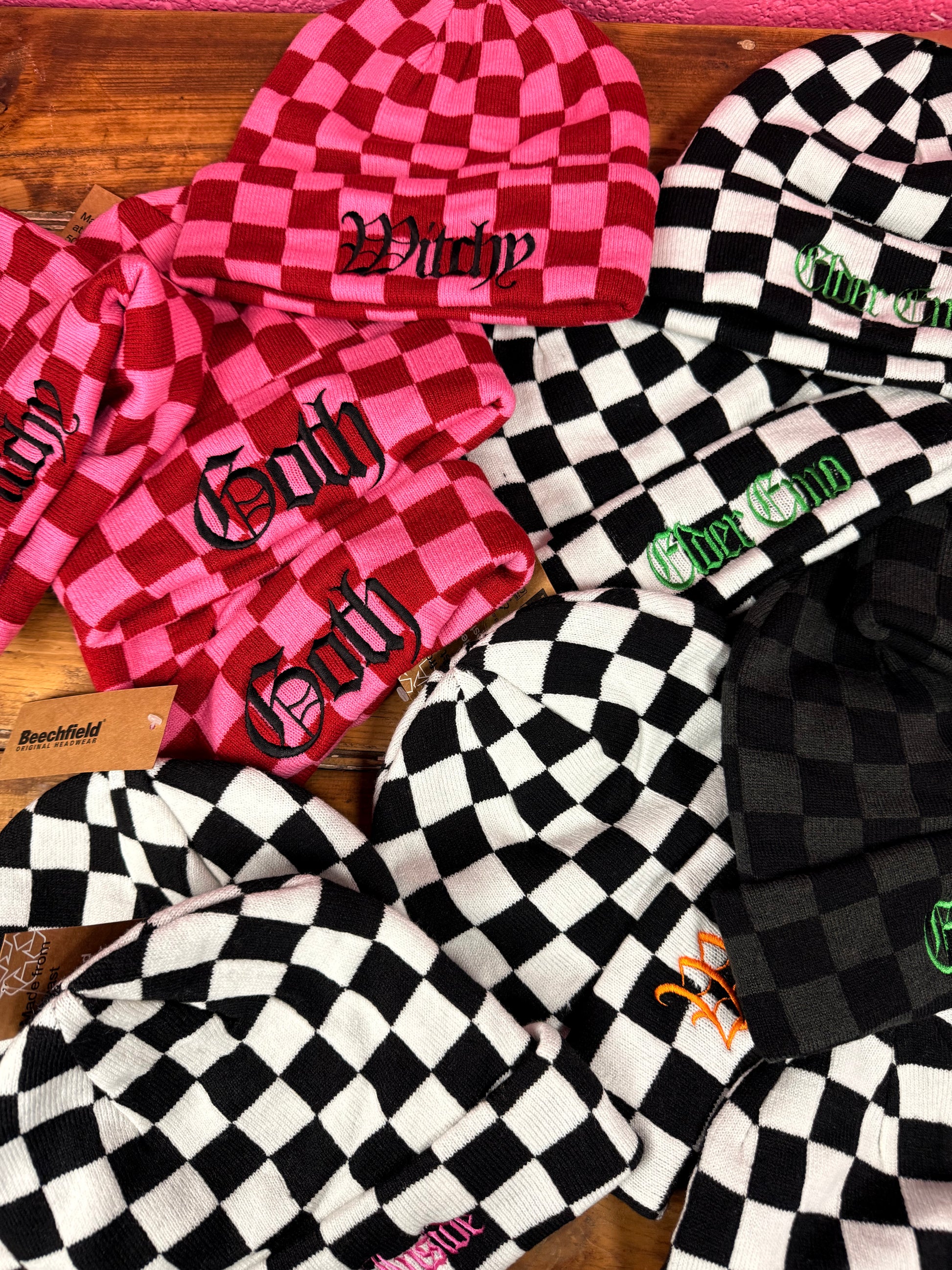 Turn heads (and keep them toasty) with our checkerboard beanies featuring bold gothic font embroidery. Pick your vibe and make it yours.