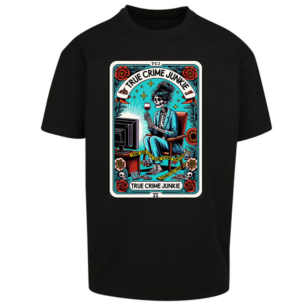 Calling all true crime addicts! Elevate your style with our premium oversized T-shirt, crafted from 100% cotton for ultimate comfort and durability. Designed to be genuinely oversized and size-inclusive, fitting up to a UK size 32 or 5XL, it's the perfect choice for all body types. Embrace your love for reading with the unique tarot card-style design featuring a skeleton immersed in a book. Whether you're a reading fanatic or part of a book club, this tee is your perfect companion.