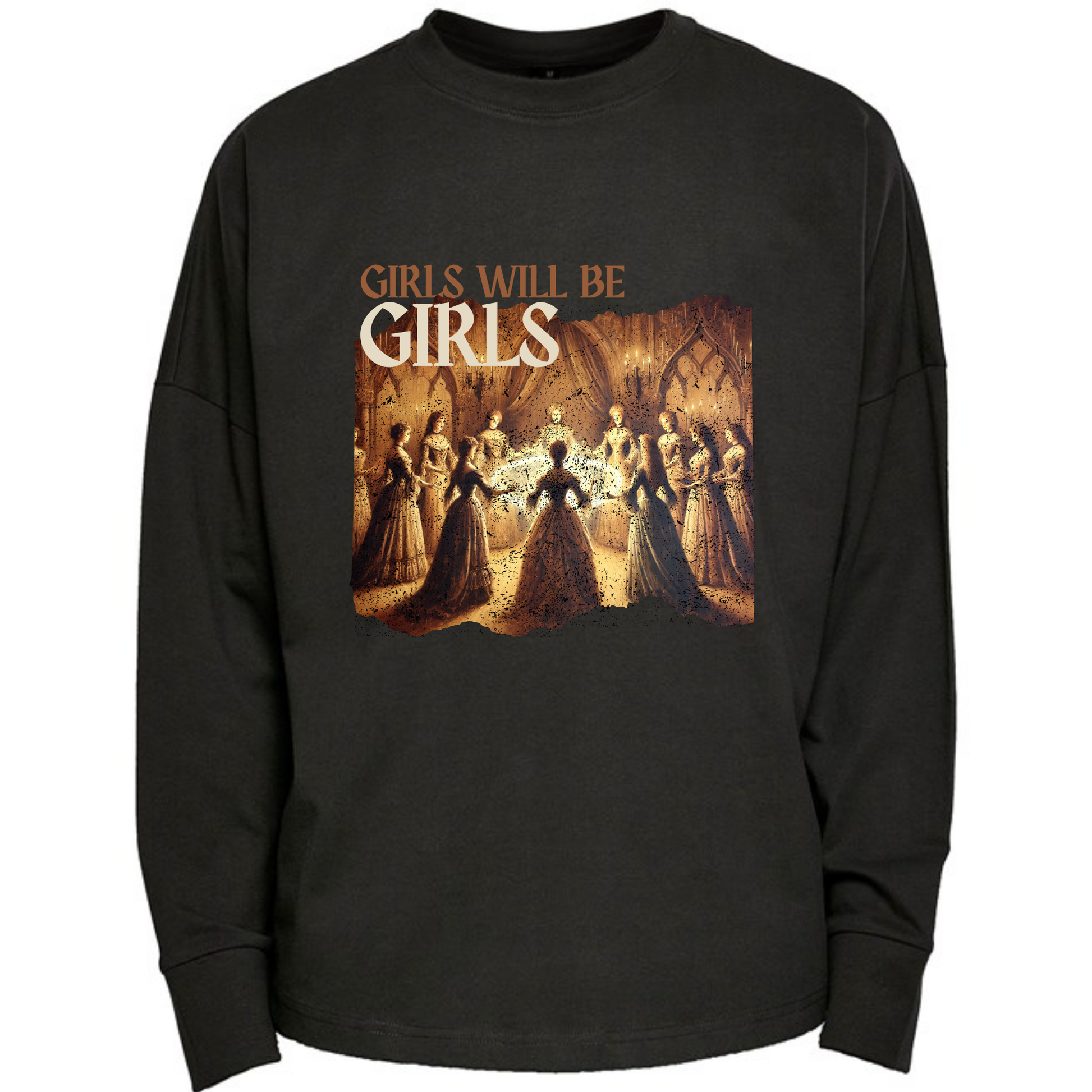 Step into your power with our Girls Will Be Girls oversized long-sleeve t-shirt, featuring a hauntingly beautiful coven of Victorian-era women. This statement piece blends gothic elegance with modern rebellion, perfect for those who embrace their mystical side. The oversized fit ensures effortless comfort while making a bold statement—because witches move in silence, but their style speaks volumes.